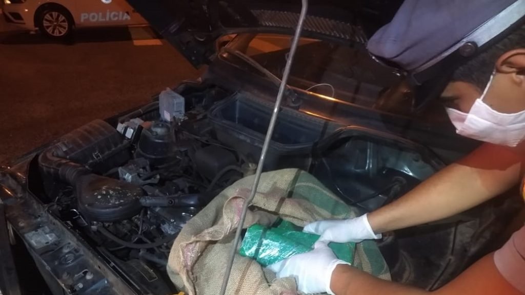 Durante a vistoria, equipe localizou grande quantidade de entorpecentes aparentemente “maconha” embaixo dos bancos dianteiros e traseiro, bem como no local do pneu sobressalente/motor.